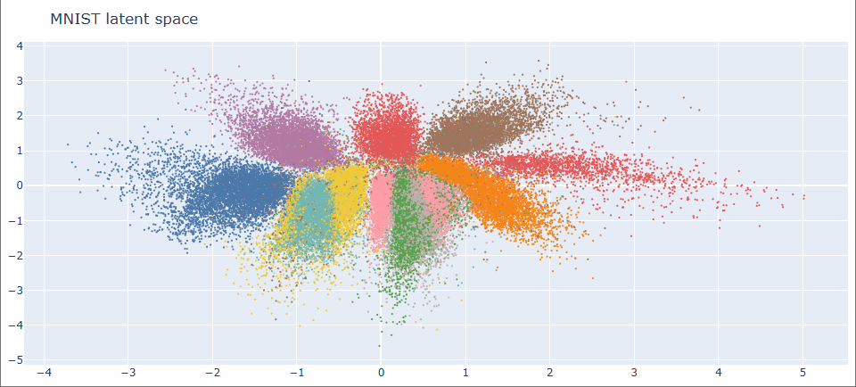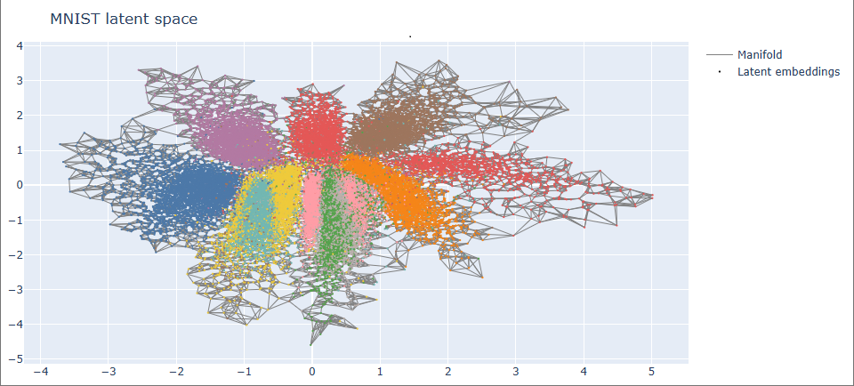 Instead of sampling from a fixed Gaussian prior \(z \sim \mathcal{N}(0, I)\), RiVAE generates data by navigating through the learned latent geometry. A well-trained VAE on MNIST defines a 2D latent space, but rather than treating it as flat, I reinterpret it as a Riemannian-like manifold induced by the model’s own epistemic structure — namely, its local uncertainty and global density.