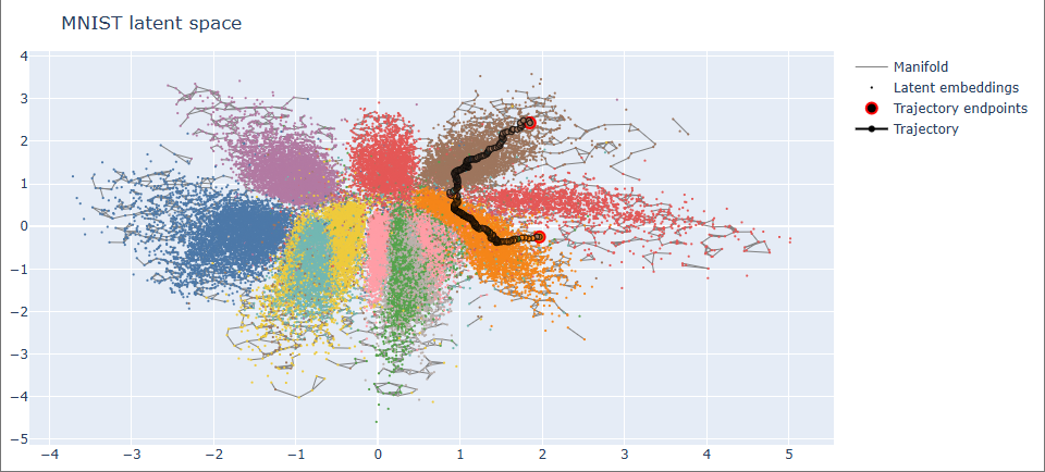 - Global density \(P(z)\): the log-likelihood under a Gaussian Mixture Model fitted on the latent embeddings. Together they define a surrogate line element: [d\mathcal{l} = (1 + \alpha_u u(z) + \alpha_p p(z)) |z_i - z_j|_2] Where \(U\) and \(P\) penalize motion toward uncertain or low-density regions.
